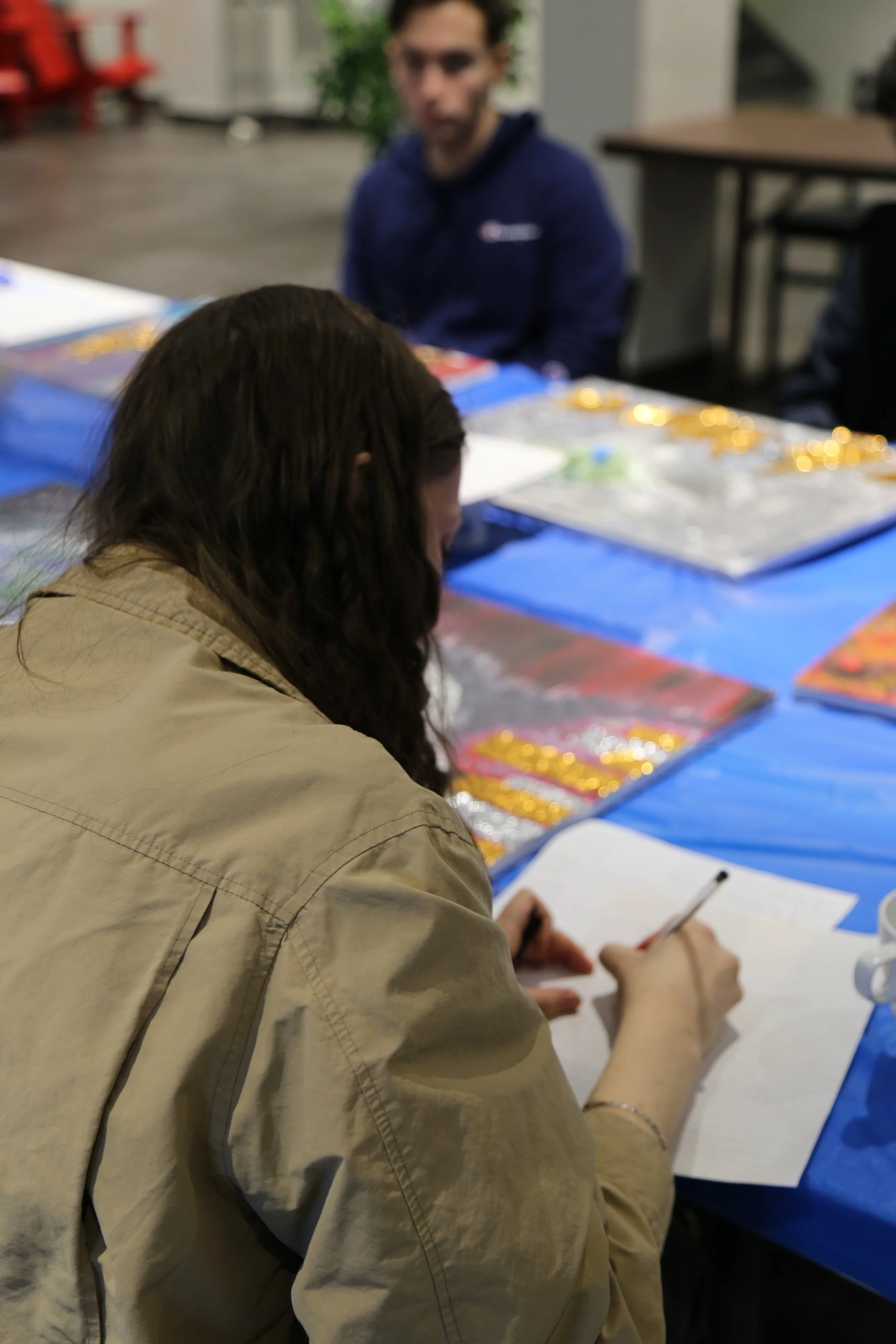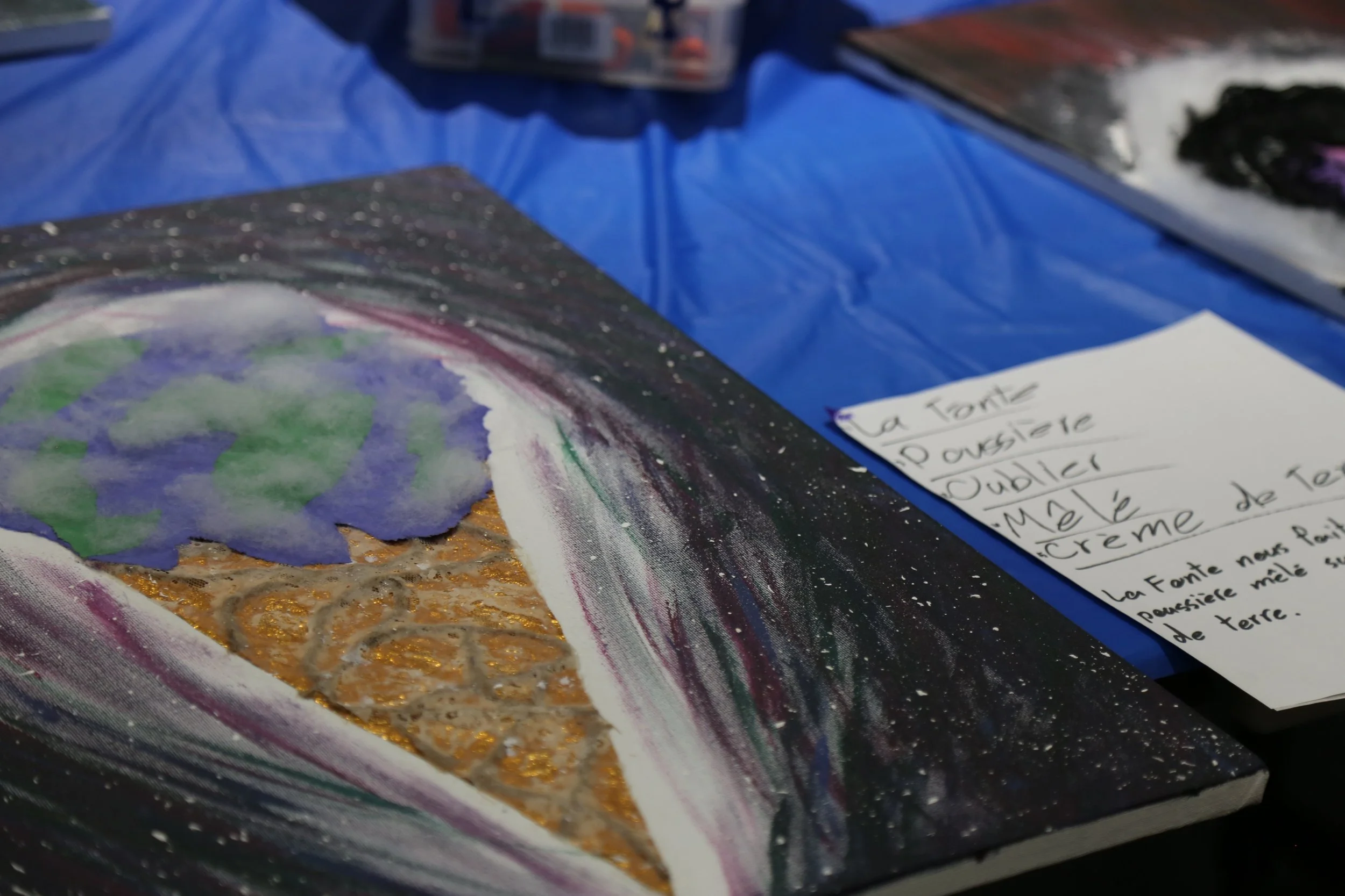 L’artiste Romain Bécourt, membre de Skol a proposé une série d’ateliers où les participants ont pu stimuler et développer leur intuition ainsi que leur réflexion autour d’un processus de création artistique centré sur la résilience et l’impact des changements climatiques sur nous et notre environnement. Au cours de ces ateliers, les jeunes ont exploré le langage et la symbolique des couleurs et renforcé leur créativité intuitive à travers l'art visuel et l'écriture. En abordant notre création sous différents médiums, les participant.es ont eu l’opportunité d’ouvrir leur sens et d’établir des connexions entre les couleurs et les mots.
